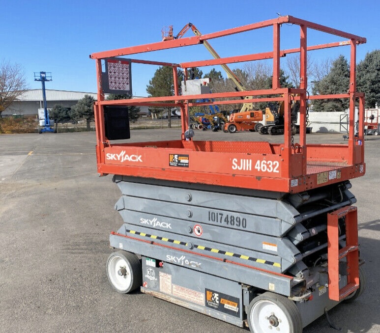 Skyjack is a well-known manufacturer of aerial work platforms, including scissor lifts. Scissor lifts are commonly used in construction and maintenance to provide elevated access to areas that are otherwise difficult to reach. This SJIII4632 has a platform height of 32′ with a working height of 38′ and is 46″ wide tire to tire.