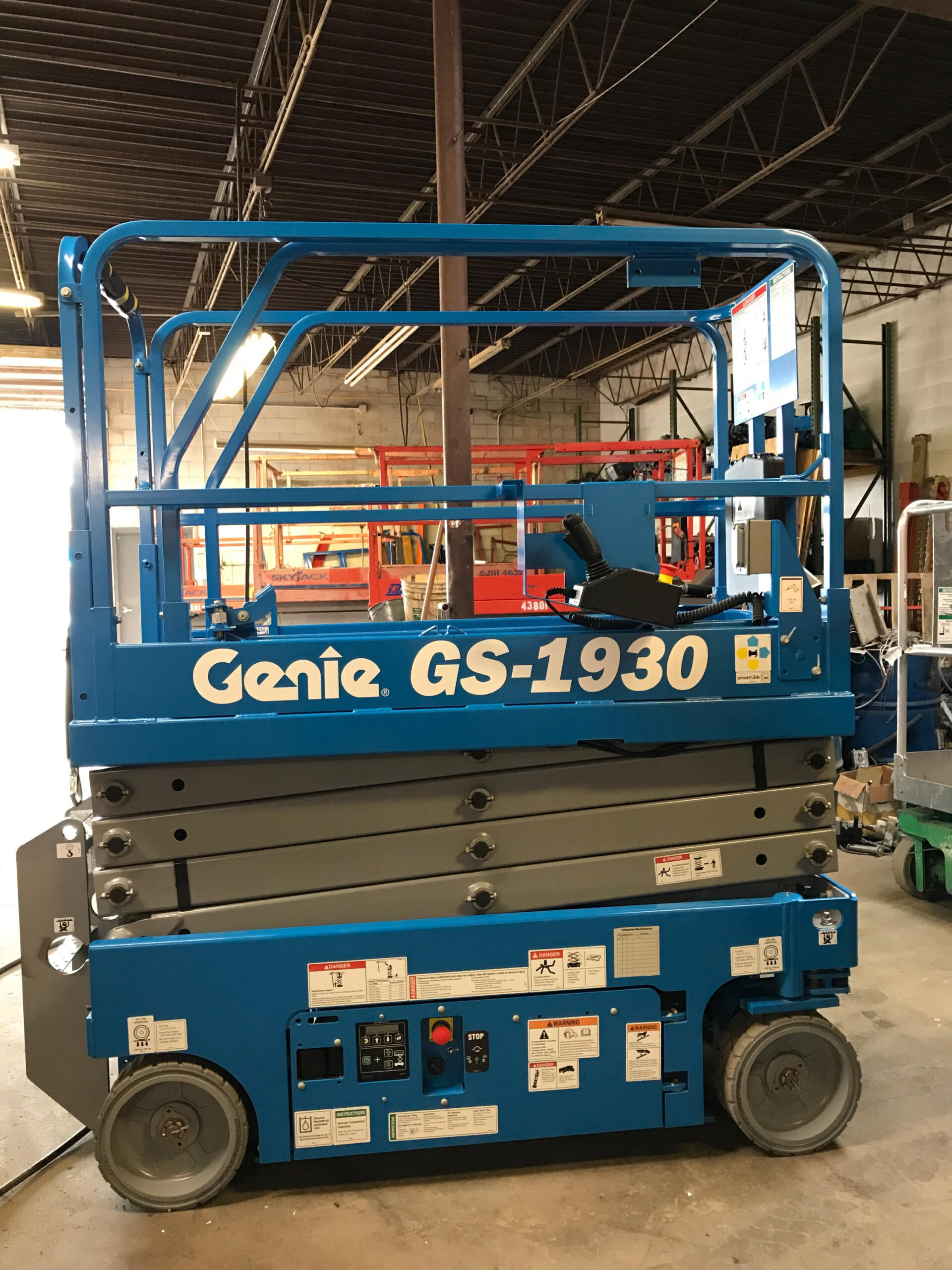 The Genie GS-1930 is a model of scissor lift manufactured by Genie Industries. It is part of the Genie GS slab scissor lift series, designed for indoor and outdoor applications that require elevated access in a compact and maneuverable platform. The Genie GS-1930 has a platform height of 19′ and is 30″ wide. The GS-1930 has a 3′ extension deck, and a working height of 25′.