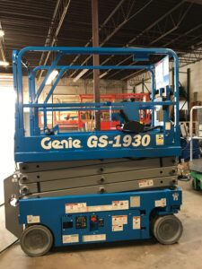 The Genie GS-1930 is a model of scissor lift manufactured by Genie Industries. It is part of the Genie GS slab scissor lift series, designed for indoor and outdoor applications that require elevated access in a compact and maneuverable platform. The Genie GS-1930 has a platform height of 19′ and is 30″ wide. The GS-1930 has a 3′ extension deck, and a working height of 25′.