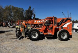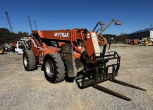 The SkyTrak 10054 is a rough-terrain telehandler designed for lifting and transporting heavy loads in construction and industrial settings. Telehandlers, also known as telescopic handlers or reach forklifts, typically feature a telescoping boom that can extend forward and upward, allowing for versatile reach and lifting capabilities.